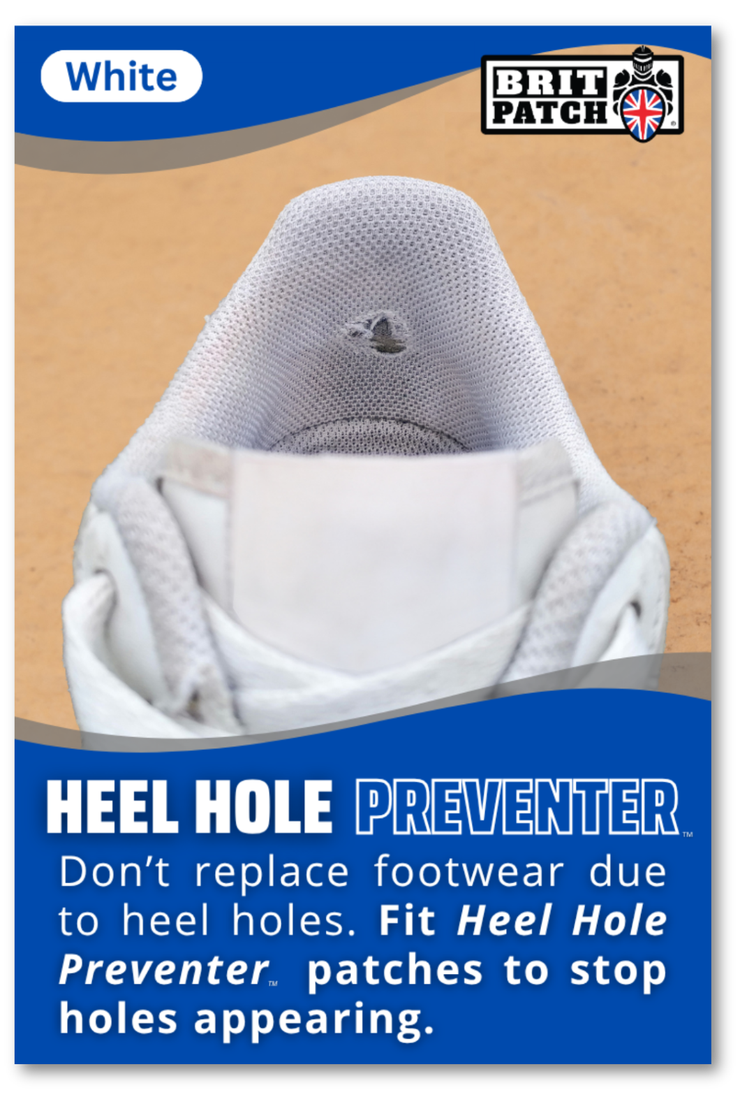 Do your shoes ever develop holes in the heel after less than a year of wear? Do you want your shoes to last longer than a couple months? Than try our Brit Patch Heel Hole Preventer. An adhesive patch attached to a cut out of a shoes' silhouette, this product can patch shoes that have already developed this issue or prevent from occurring if applied before a hole forms. This nifty little invention will extend the lifespan of your shoes rather than having to replace them or suffer the indignation of holey shoes.